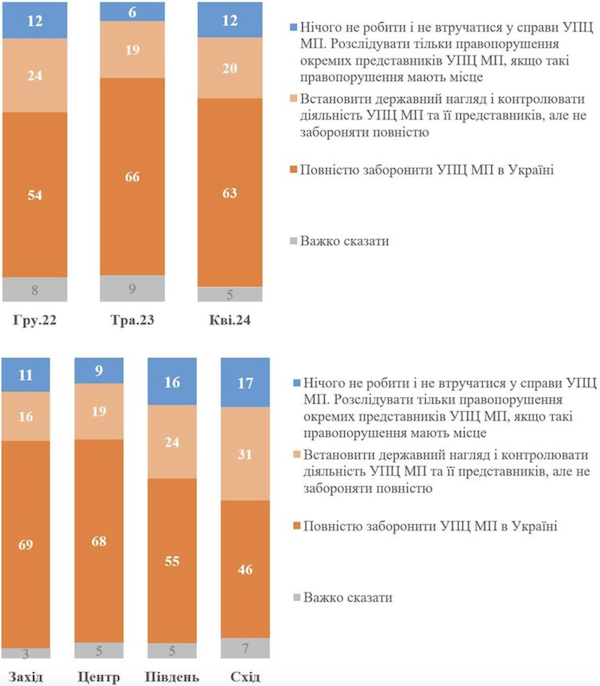 За даними КМІС, у всіх регіонах України більшість населення (від 76% на сході до 85% на заході й 86% в центрі) виступають за проактивну позицію держави в питанні діяльності УПЦ (МП). Водночас на півдні й сході трохи менше тих, хто виступає за повну заборону (55% і 46% проти, відповідно, 69% на заході й 68% в центрі).