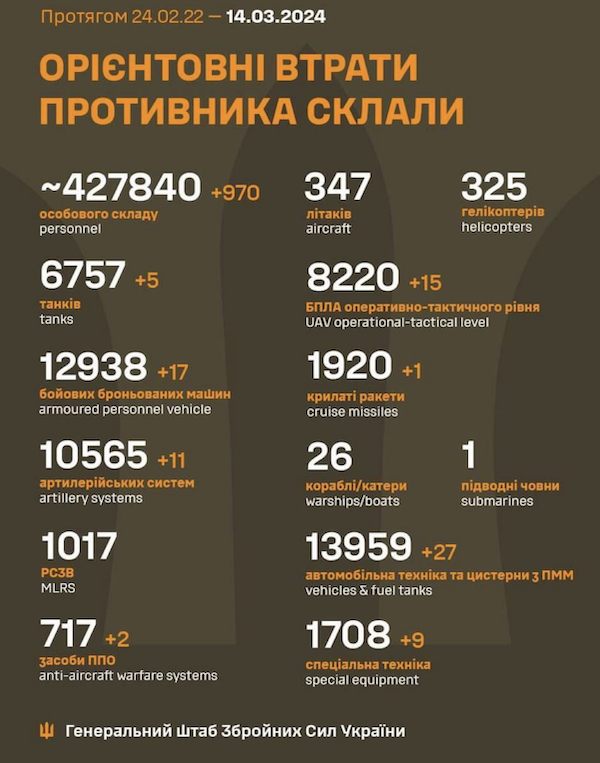 Загальні бойові втрати армії Російської Федерації в Україні з 24 лютого 2022 року по 14 березня 2024 року становлять близько 427 тисяч 840 осіб, з них 970 – за попередню добу. Про це у Фейсбуці повідомляє Генеральний штаб Збройних сил України.