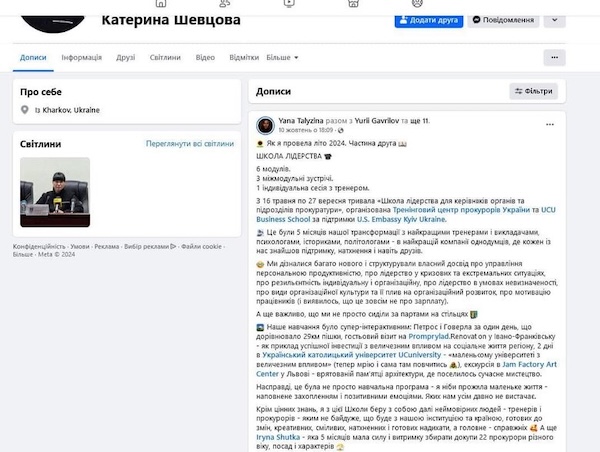 В публічному просторі про Катерину Шевцову мало  відомо. Але на її сторінці у "Фейсбуці" є кілька постів з фотографіями від інших осіб, де вона відмічена. І судячи з них, пані прокурор цього року брала участь в "Школі лідерства для керівників органів та підрозділів прокуратури", організованій Тренінговим центром прокурорів України.