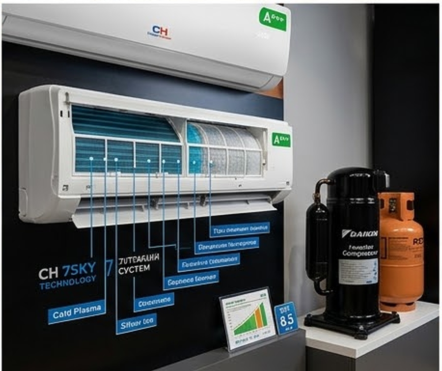 Дополнительные технологии включают систему очистки CH 7SKY TECHNOLOGY с семью ступенями фильтрации. По оценкам World Health Organization, качество воздуха внутри помещений напрямую влияет на здоровье, и наличие многоуровневой фильтрации снижает концентрацию аллергенов и бактерий до 90%.
