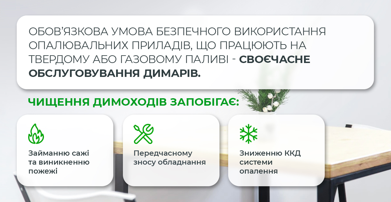 | Очищення димоходів | Видалення сажі, перевірка тяги, відеоінспекція | Стабільна тяга, безпечне використання опалення |