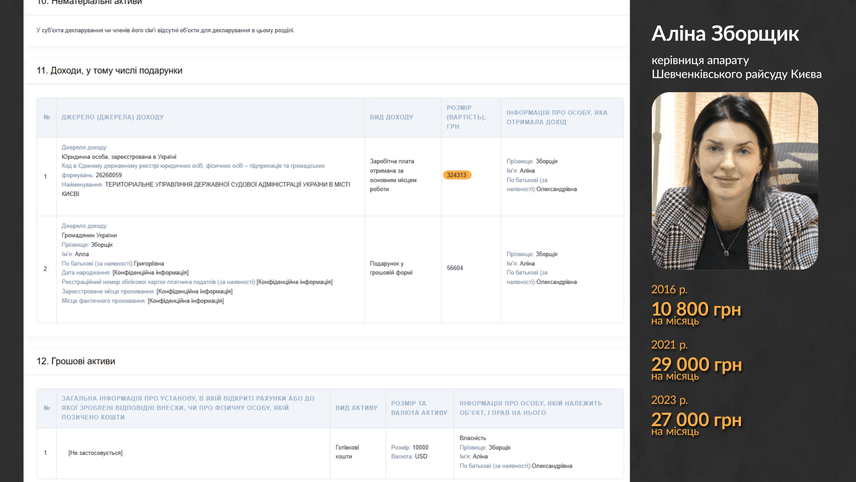 У 2016 році зарплата Аліни Зборщік становила 10 800 грн на місяць. У 2021 році — 29 000 грн на місяць. Зараз — 27 000 грн. Жодних інших постійних офіційних доходів у жінки не було й немає.