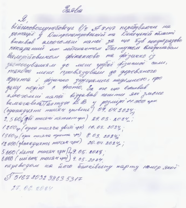 Дослівно з пояснення зі збереженням стилістики і пунктуації: "Даю пояснення з приводу мого побиття в районі виконання бойових завдань в Донецькій області. Моє побиття організував ст. лейтенант Пастух про що свідчить фотографія, а також ст. лейтенант Пастух вимагав в мене кошти 8.03.2024 в розмірі 5000 гр…"