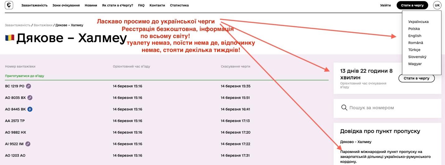 Але це ще не все. У цій же єЧерзі вже зроблені можливості для "постановки у чергу" для іноземних водіїв. Туалетів у "є-чергах" по 20-30 км завдовжки немає, харчування нормального для водіїв немає, обов’язковий для європейців "Режим праці та відпочинку водіїв" немає можливості дотримуватися з нашими чергами в тижні та місяці, а Україна "на повному серйозі" замість вирішення проблеми черг нав’язує примусову реєстрацію в е-кабінеті чужої держави. Так, ще й нав’язує розуміння, що так і треба.