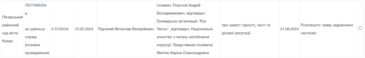 У 2024 році Портнов позивався проти Руху ЧЕСНО щодо захисту честі, гідності та ділової репутації. Екснардеп вимагав видалити його з Реєстру зрадників та спростувати недостовірну інформацію щодо нього. Справу розглядав суддя Печерського суду Вячеслав Підпалий. Він теж оголосив рішення на користь Портнова. Раніше ЧЕСНО повідомляв, що подає апеляцію.
