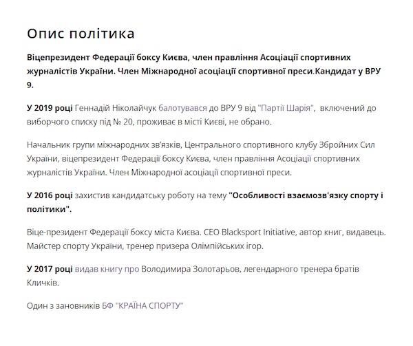 “Партія Шарія” програла вибори 2019 року, набравши 2,23% голосів, і Ніколайчук повернувся до своєї спортивної діяльності: працював начальником групи міжнародних зв’язків Центрального спортивного клубу Збройних сил України, йдеться в повідомленні.