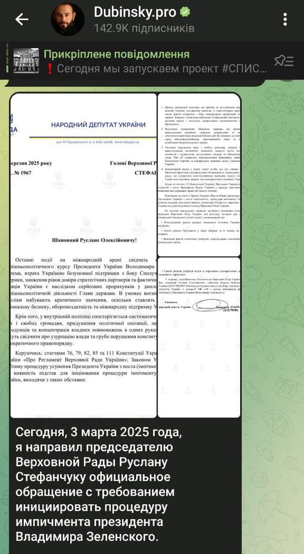 А нещодавно підозрюваний у держзраді Дубінський звернувся до голови Верховної Ради з вимогою ініціювати процедуру імпічменту Володимира Зеленського. Підставою для такої ініціативи нардепа буцімто став конфлікт президента України з президентом США Дональдом Трампом під час пресконференції 28 лютого цього року.