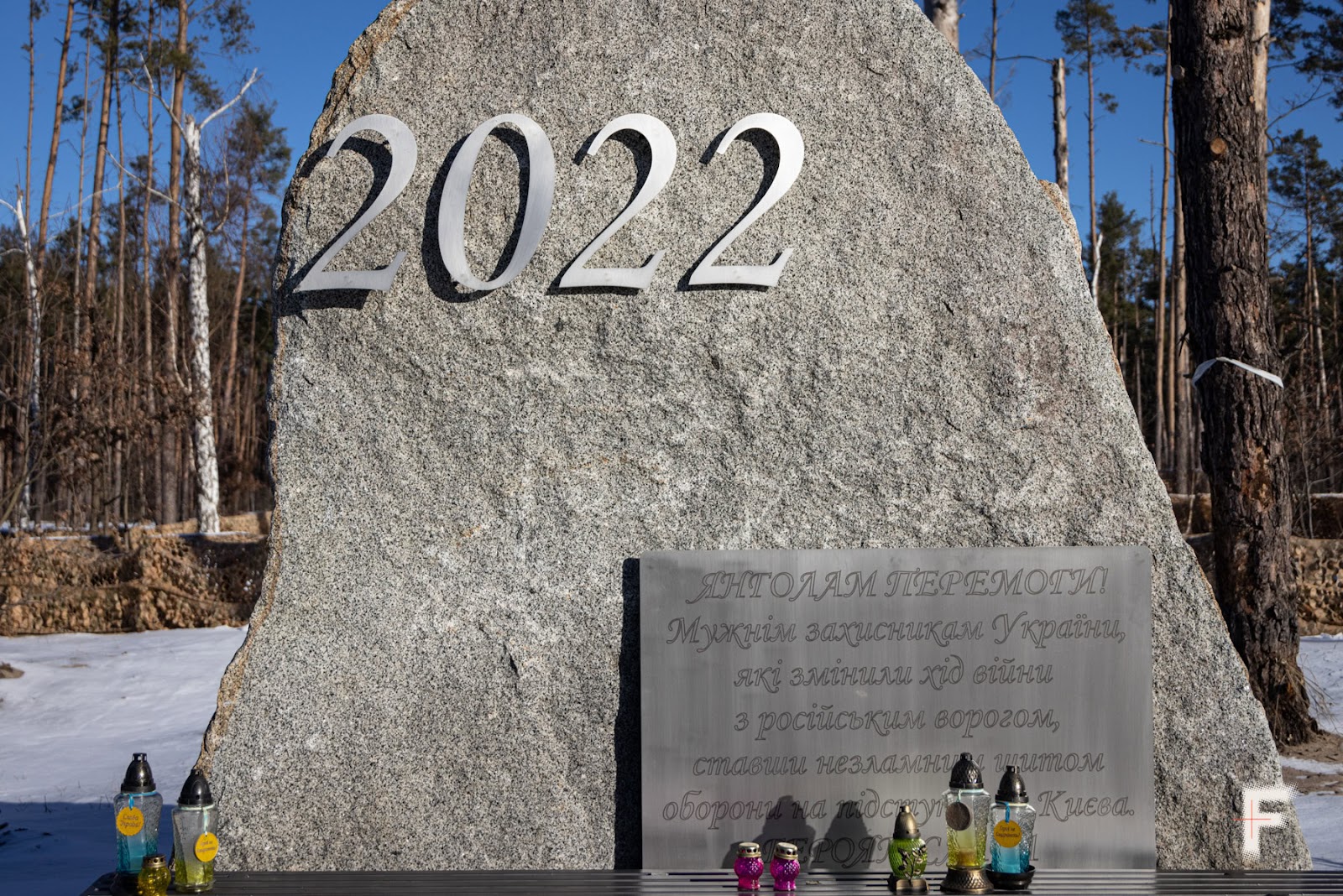 Меморіал «Янголам перемоги», встановлений у селі Мощун загиблим героям, які обороняли його, с. Мощун, Київська область, Україна, 13 лютого 2024 року. Данило Дубчак / Frontliner