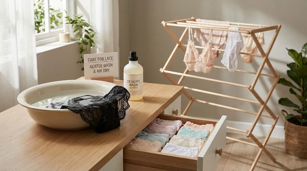 Кружевные трусики нельзя сушить на батарее и под прямым солнцем: тепло деформирует волокна, а ультрафиолет ускоряет выгорание. Правильнее аккуратно промокнуть изделие полотенцем и сушить в тени при комнатной температуре, расправив края. Женские трусы с тонким кружевом не стоит выкручивать, иначе появятся заломы и перекос посадки. Для хранения лучше выделить отдельный ящик, чтобы кружевные модели не цеплялись за фурнитуру и не мялись. Если вы часто носите хлопковые и кружевные трусы, держите их раздельно: так проще поддерживать порядок и быстрее находить нужные трусики.