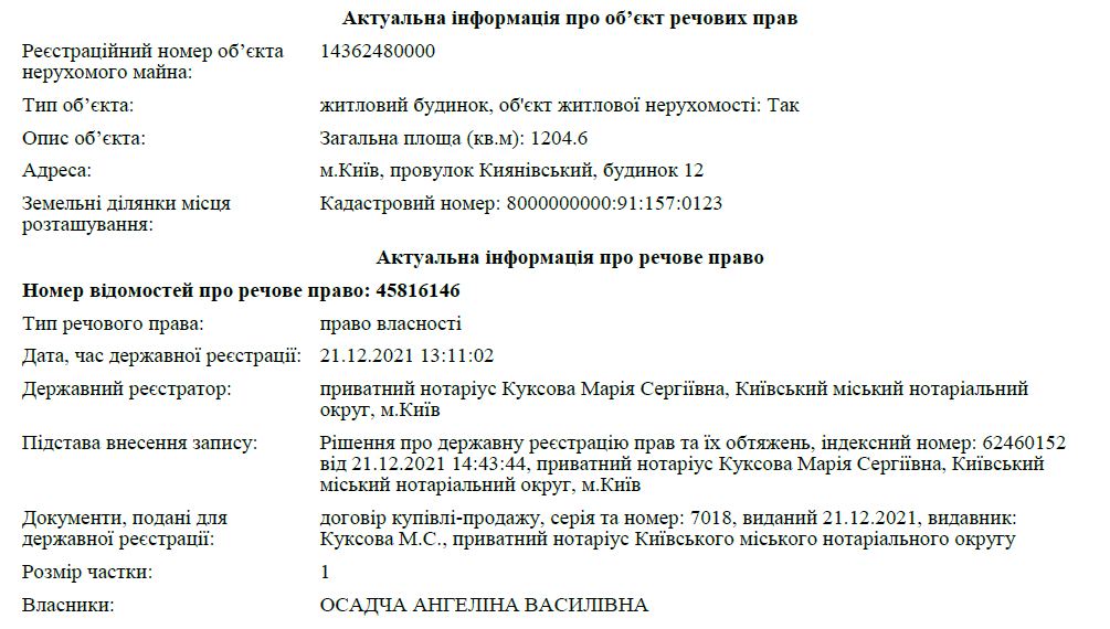Відповідно до даних Держреєстру прав, ця будівля із земельною ділянкою належить Ангеліні Василівні Осадчій.